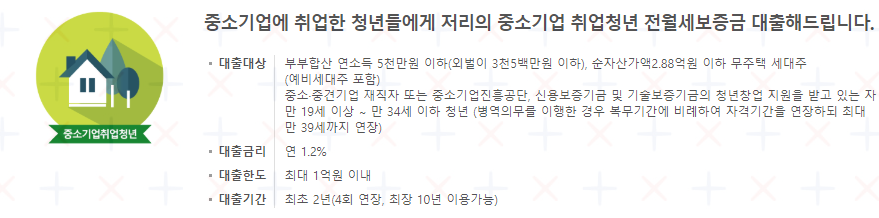 중소기업에 취업한 청년들을 위해 국가(주택도시기금)에서 지원해주는 저금리 전월세보증금대출입니다.