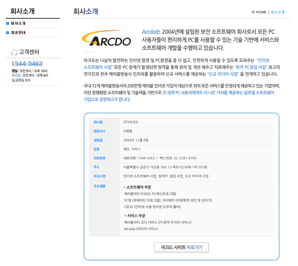 그리고 15445463이 번호는 이 회사의 대표전화번호입니다. 회사명은 Arcdo라는 곳인데요. 실제로 대표홈페이지 화면에 고객센터 전화번호를 확인할 수 있습니다.